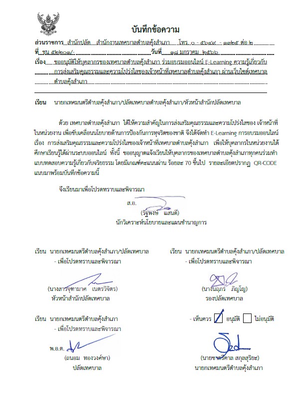 เทศบาลตำบลคุ้งสำเภาขอให้บุคลากรทุกท่านเข้าร่วมการอบรมผ่านระบบออนไลน์ E-Learning ของสำนักงานคณะกรรมการป้องกันและปราบปรามการทุจริตแห่งชาติ (ป.ป.ช.) เพื่อเสริมสร้างองค์ความรู้ ด้านการต่อต้านการทุจริตและจริยธรรมในยุคดิจิทัล